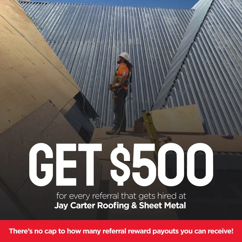 Get $500 for every referral that gets hired at Jay Carter Roofing & Sheet Metal...
